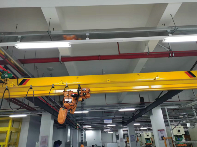電動單梁懸掛起重機由鋼板與工字鋼組焊成的主梁、端梁、電動葫蘆及電動跑車組成,懸掛在廠房上部的工字梁軌道上,懸臂長度0.5~1m,電動葫蘆沿主梁工字鋼下翼緣運行,完成物品的吊運工作,具有結(jié)構(gòu)輕巧、安裝維護方便等特點,廣泛應(yīng)用于生產(chǎn)車間、倉庫及貨場等場所。工作級別為A3-A5。