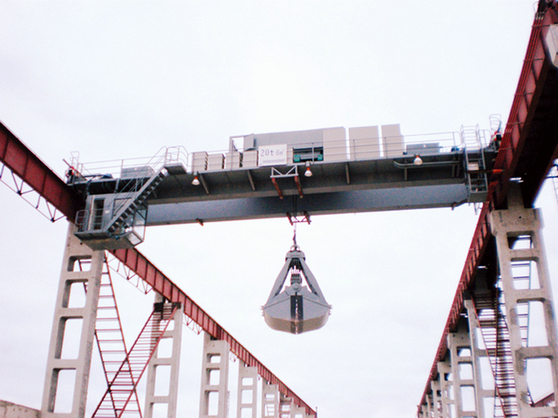 抓斗橋式起重機(jī)主要由箱形橋架、抓斗小車、大車運(yùn)行機(jī)構(gòu)、司機(jī)室和電氣控制系統(tǒng)組成。取物裝置為抓斗。抓斗小車上布置有起升機(jī)構(gòu)和開閉機(jī)構(gòu),抓斗以四根鋼絲繩分別纏繞在起升和開閉卷筒上。開閉機(jī)構(gòu)驅(qū)動(dòng)抓斗閉合,抓取物料,當(dāng)斗口閉合后,立即開動(dòng)起升機(jī)構(gòu),使四根鋼絲繩平均受載進(jìn)行起升工作。卸料時(shí)只開動(dòng)開閉機(jī)構(gòu),斗口隨即張開,傾斜物料。本起重機(jī)除起升機(jī)構(gòu)不同外,其余結(jié)構(gòu)部分與吊鉤橋式起重機(jī)基本相同。